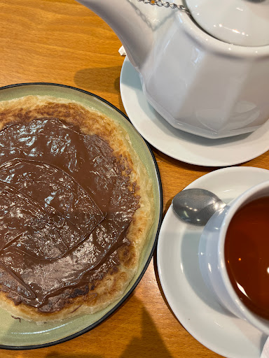 Beautifull location, next to the Church on a corner, so nice to look at people moving around. Good products. The maroccan mint thee was refreshing. Our Kids love the fresh tea and the maroccan pancake. Friendly and fast service. Close your eyes and the music make you feel like you're in the north of Africa.