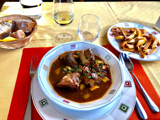 Pleasant, attractive and quiet room, traditional menu, efficient somewhat indifferent service, easy parking. A nice lunch break. Especially enjoyed the starting escargot and finishing cheese courses. On the main street of the town, it is easy to find. Open a little later for lunch than other recommended places.