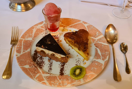 Association of biche, blueberry, tangy red cabbage, impeccable on the other hand, chocolate sauce on the wild boar kills the taste of the meat (can be put aside) then we have a disciple of Marc Veyrat. (The boss) Herbs as a salad with the cheese, I didn't like it, it's my choice. And dessert, the Aphrodite cake, is killer.