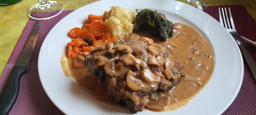 Affordable prices: generous veal escalopes in cream sauce with mushrooms, plus side dishes and sauerkraut, also generous, a glass of wine and two coffees for €53.