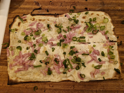 The setting is very pretty and welcoming; you wouldn't expect a beautiful wine cellar to be located right under a kiosk—it's quite original. The tarte flambée was delicious, and the cordon bleu with Morbier cheese was very generously portioned. The sauce, however, was very oily and lacked a bit of seasoning. The spaetzle were homemade, and it showed, but it's a shame about the bread, which was definitely a standardized, mass-produced loaf. A pity about that. The service was very friendly. It's a good place to share a nice meal.