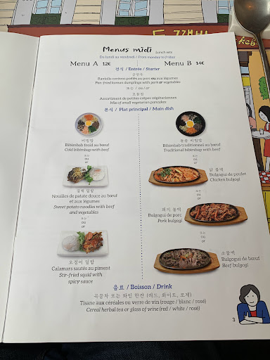 Repas excellent, nous avons mangé un barbecue au boeuf et un bibimbap au poulet, accompagnés des petits amuse bouche très fréquents dans les restos coréens, le rapport qualité prix est imbattable, le personnel est adorable