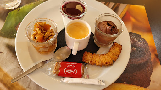 Nice coffee and a nice salad. The dog is not allowed inside, you can sit outside on the side, but it didn't look very clean. It does look clean inside. It is better to pick up/take along a dog and sit under the trees behind the parking lot. There are benches there.