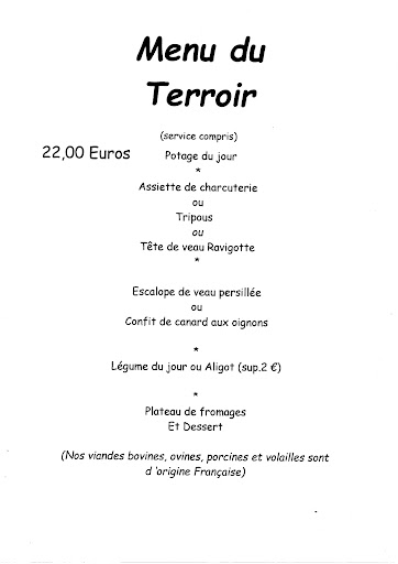 Pumpkin soup, calf's head, tripe, leg of lamb, Cantal, dessert. Excellent. Very warm welcome.
