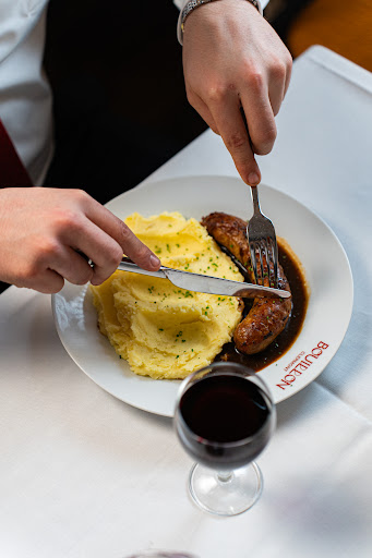 A lovely restaurant with white tablecloths and beautiful stucco ceilings. Large glass chandeliers illuminate the room, and the service was friendly and very attentive, though unfortunately a bit overwhelmed. The food arrived very quickly and some of it was really good (the onion soup and the beef with homemade fries, for example). Everything else was rather average, such as the champagne terrine, the calf's head, and the sausage with mashed potatoes. Prices were very fair, and the house red wines were also decent.