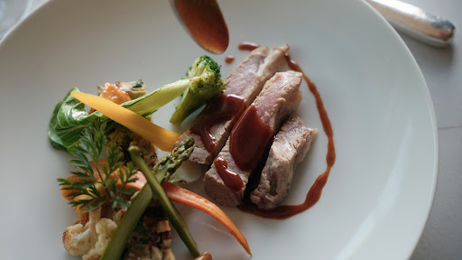 Le fond est là mais il manque de la saveur dans les plats. La tarte de courgettes est bien faite mais il manque la petite sauce à côté qui en ferait ressortir la saveur (une petite nage de basilic par ex.). Idem pour le cannellon d’oie qui est fondant mais un jus de viande viendrait lui donner plus de saveur ainsi qu’aux légumes qui sont juste posés là sans beaucoup de goût. Le fond est là avec des produits de qualité mais on aimerait que le chef propose des sauces et des jus pour rehausser ses plats