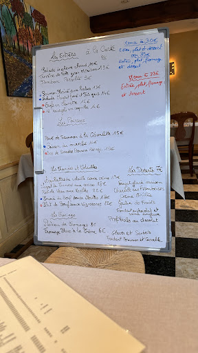 We (an elderly couple with a dog) went to the restaurant La Vieille Auberge. Simple decor, room for the dog. Menu offerings were displayed on the blackboard set up for us.