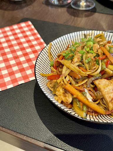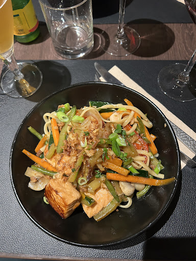 Enjoy a drink with pleasant jazz music and afterwards enjoy a delicious stir-fried meal with salmon, among other things. Good atmosphere ! Recommended.