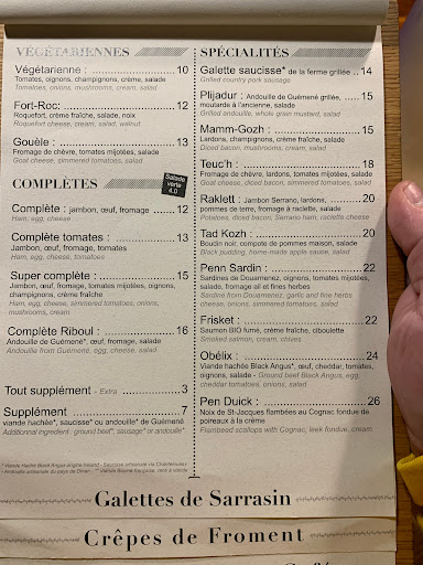 While looking for a great crêperie in St-Malo I followed my nose and was not disappointed. All staff were helpful in both french and english; the selection of local ciders and wines was spot on; the galette entrées were delicious and the desert crêpes were to die for. My only complaint is that we didn`t eat here until our last night leaving many menu options unexplored. Would come here again, 100%.