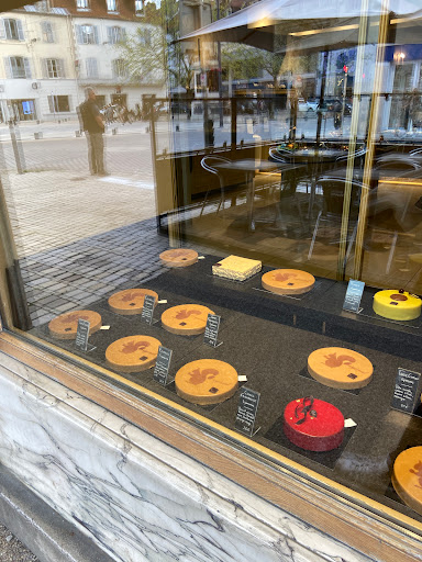 Ιστορικό ζαχαροπλαστείο πάνω στην κεντρική πλατεία του Λόνς-Λέ-Σωνιέ,ξύλινος διάκοσμος και φανταστικά γλυκά, ειδικότης του ο «Σκίουρος»