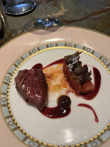 Un petit bémol sur le plat poisson (trop de sauces qui dénature le rouget) et le plat viande (canard en deux façon)