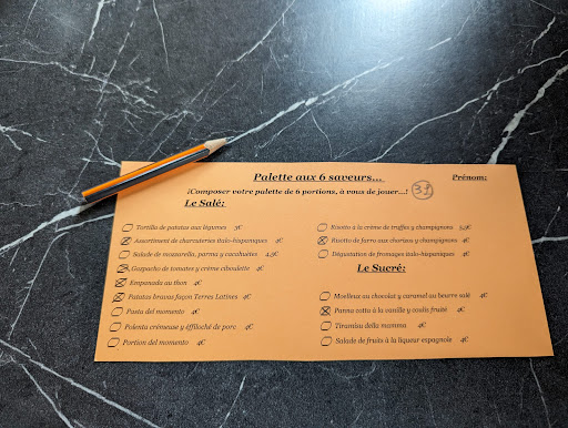 Great concept! A platter of 6 flavors to choose from among 12 savory and 4 sweet options: all you need to do is indicate your first name on the card and check what you want... the hardest part is to only check 6! Fast service and very friendly staff, delicious flavors. A very pleasant lunch.