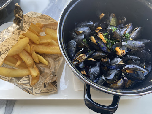 Fish and chips for our teenagers, mussels with cheese and chorizo for the adults. Everyone was happy with their meal.