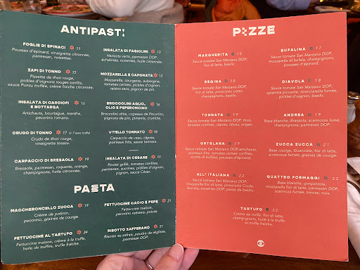 The decoration is original and superb, to our taste of course, the menu is simple, mainly pizzas and pastas plus a few desserts.